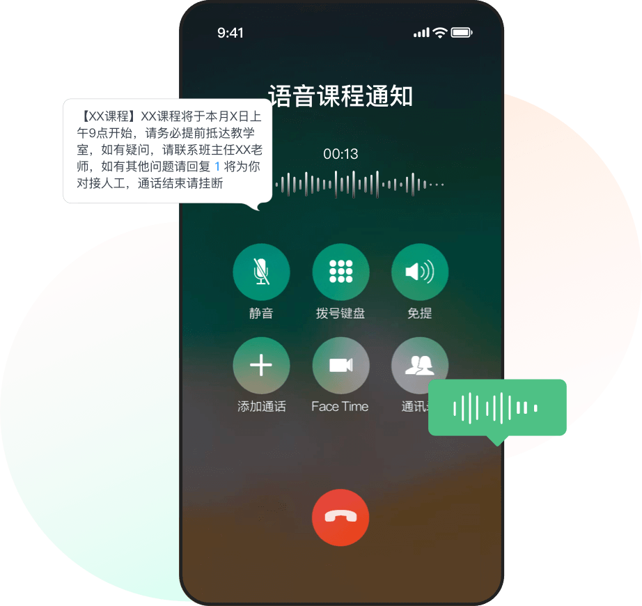 通过云通信平台能力学生考勤、开课时间地点变更、作业安排、考试成绩等通过短信告知学生及家长,实现信息快速传递,提高服务质量